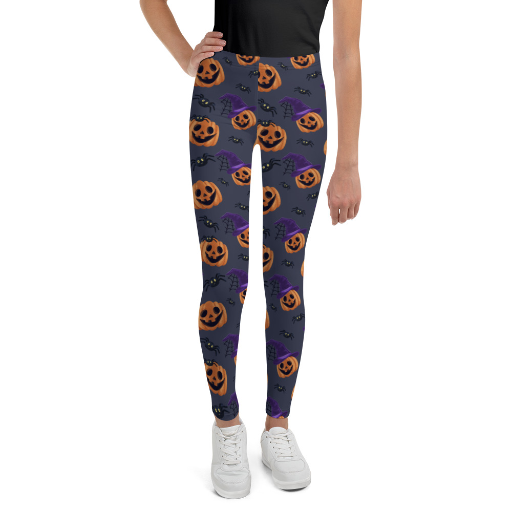 Halloween Pumpkins in Witch Hats and Spiders Youth Leggings